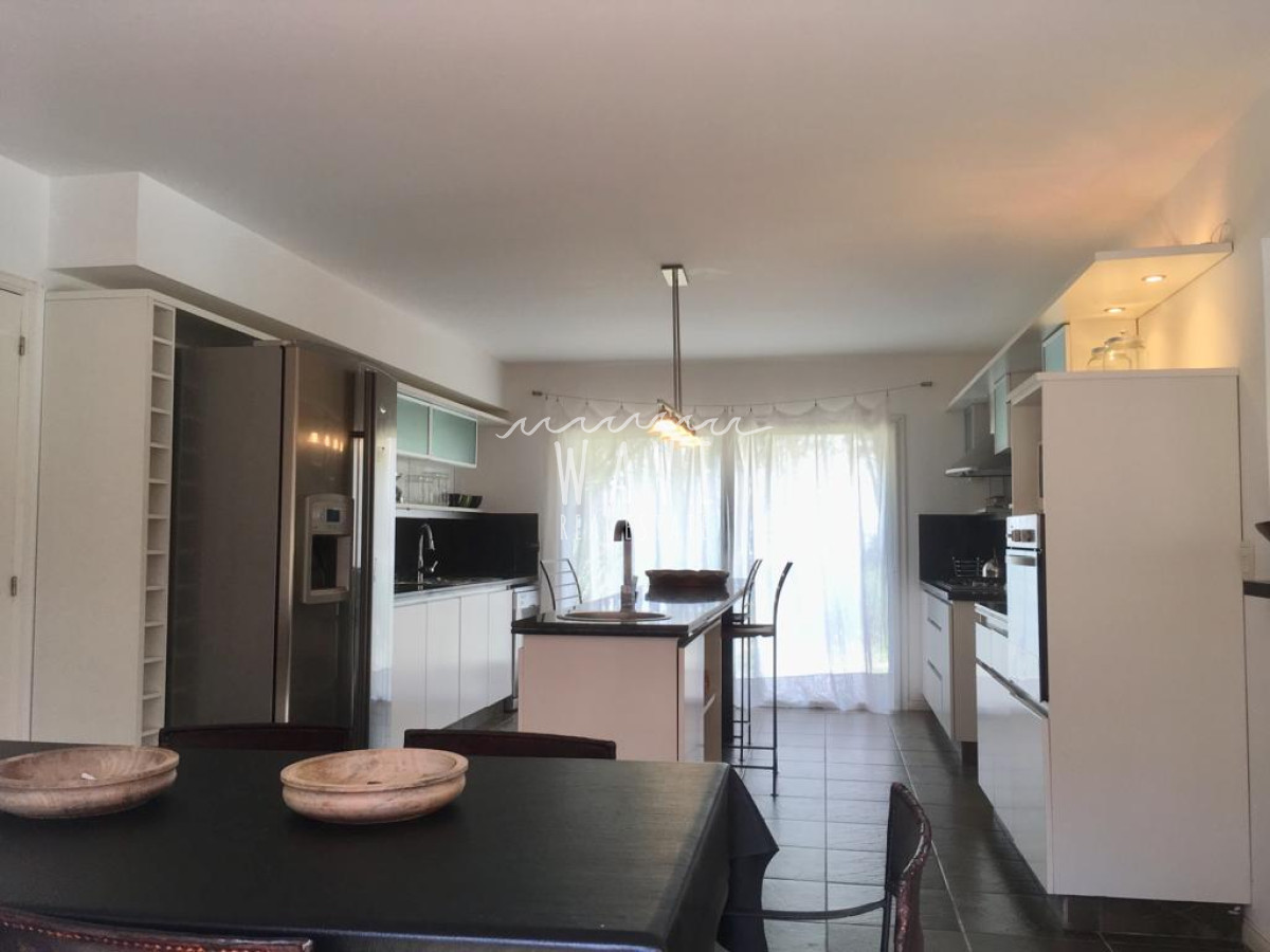 En plata baja: living con sala de estar que se comunica al comedor para 12 personas, este sector rodea el patio interno que le da circulación visual e iluminación natural a la recepción; galería exterior al fondo rodeando la piscina. Cocina muy bien equipada, y encontramos abajo 1 dormitorio en suite y otros 2 dormitorios compartiendo un baño. Toillete.
